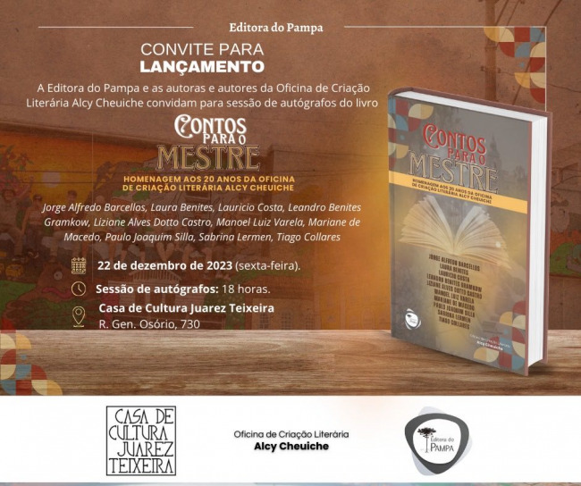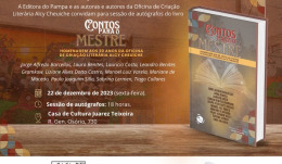 No próximo dia 22 de dezembro, sexta-feira, às 18 horas, a Casa de Cultura Juarez Teixeira sedia o lançamento do livro "Contos para o Mestre - 20 anos da Oficina de Criação Literária Alcy Cheuiche". A obra celebra duas décadas desse projeto de criação literária, pelo qual já passaram centenas de alunos. Três escritores de Caçapava do Sul participam da coletânea e estarão presentes no lançamento: Mariane de Macedo, Laurício Costa e Liziane Alves Dotto.