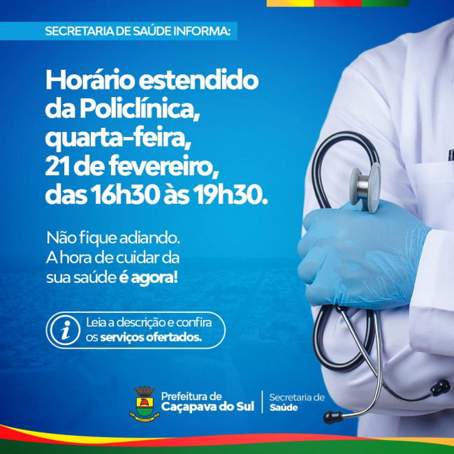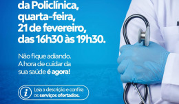 A Prefeitura Municipal, por meio da Secretaria de Saúde, comunicou à população que amanhã, quarta-feira, 21 de fevereiro, o horário da Policlínica será estendido. O órgão funcionará das 16h30 às 19h30, com os seguintes serviços: