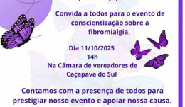 O Grupo de Fibromialgia Portal do Pampa de Caçapava do Sul promove no dia 11 de outubro, às 14h, um evento especial de conscientização sobre a fibromialgia. A atividade será realizada na Câmara de Vereadores e contará com palestras, prestação de contas e encerramento com coquetel de confraternização.