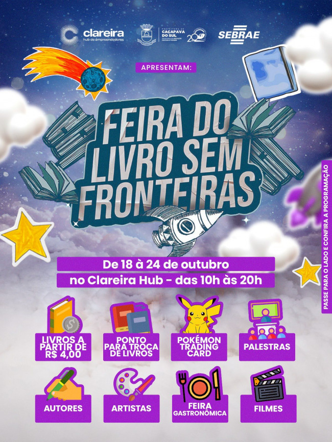De 18 a 24 de outubro, o Hub Clareira será palco da Feira do Livro Sem Fronteiras, um evento que reúne literatura, arte, tecnologia e novas experiências culturais dentro da programação dos 194 anos de Caçapava do Sul.