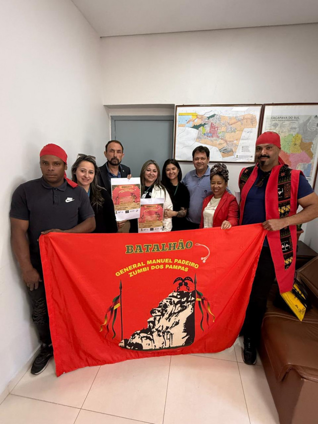 Na manhã desta terça-feira, 11 de novembro, o vice-prefeito Mariano Teixeira recebeu, em seu gabinete, os representantes do Grupo Cultural Lanceiros Negros General Manuel Padeiro Zumbi dos Pampas: Fernando da Silva Lopes Comandante do Batalhão e Cipriano Simões dos Santos líder de tropa, que realizaram a entregar o convite da cerimônia de promulgação da Lei Municipal nº 5.346/2025, de autoria dos vereadores Peter Linhares, Tiago Freitas e Giordano Borba, que institui o dia 14 de novembro como o Dia dos Lanceiros Negros no calendário oficial de Caçapava do Sul.