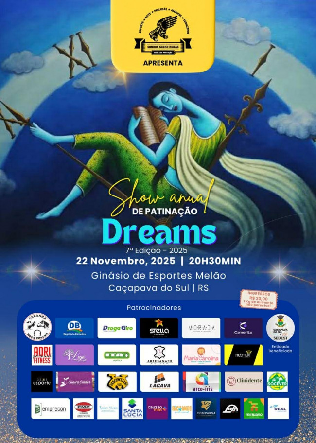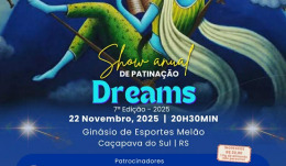 A Escola de Patinação Sonhos Sobre Rodas promove o show anual de patinação artística neste sábado, 22. As apresentações ocorrerão no Ginásio de Esportes Melão, a partir das 20h30min.