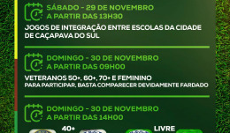 Já no domingo, 30 de novembro, a agenda começa cedo, às 9h, com disputas entre atletas veteranos das categorias 50+, 60+, 70+ e também do feminino. Para jogar, basta que os times compareçam devidamente fardados.