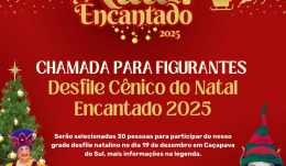 Quer viver a magia do Natal no palco da nossa cidade? Então vem participar do Grande Desfile Cênico do Natal Encantado, dia19 de dezembro, em frente ao CTG Sentinela dos Cerros, com encerramento no Largo Farroupilha, durante a Festa de Natal e a Convenção dos Papais Noel.