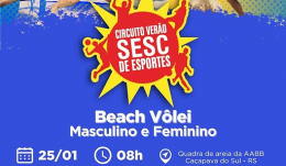 A quadra de areia da AABB, em Caçapava do Sul, recebe neste domingo, 25 de janeiro, uma etapa do Circuito Verão Sesc de Esportes, com disputas de Beach Vôlei nas categorias masculino e feminino.