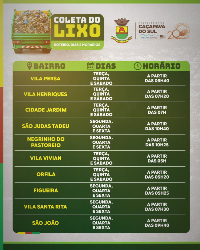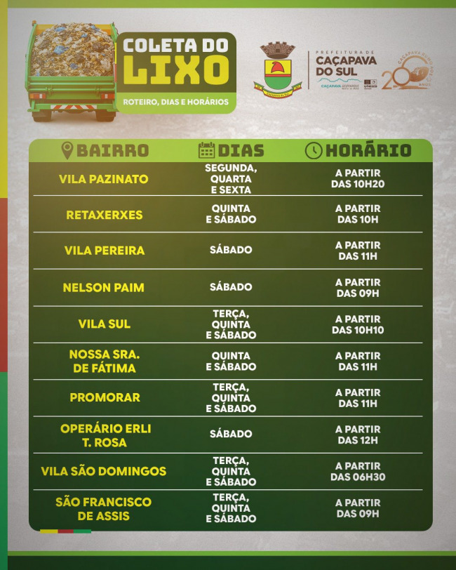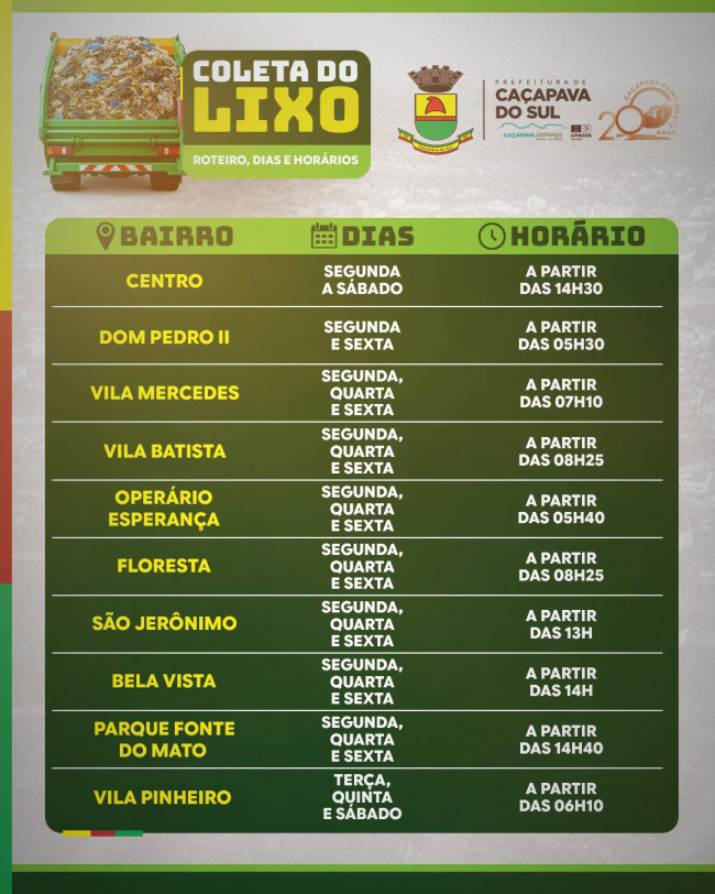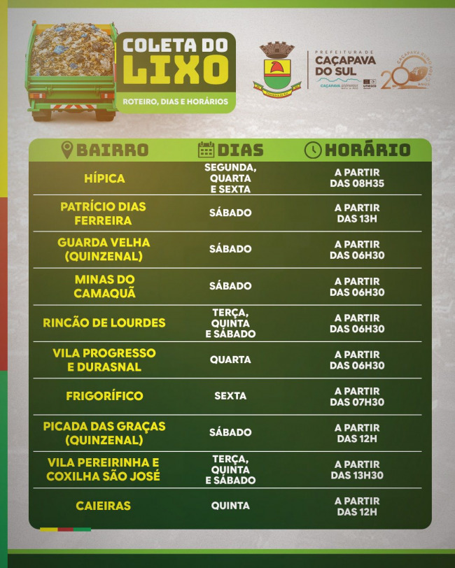 A Prefeitura Municipal de Caçapava do Sul divulgou um calendário com os novos dias e horários da coleta do lixo na cidade e pontos do interior. As Secretarias de Obras e Planejamento aproveitaram a troca da empresa do recolhimento e aumentar o roteiro para outras regiões e também organizar a compra de novos contêiners. O novo calendário é para o lixo doméstico, já os restos de construção a prefeitura não recolhe por ser de responsabilidade do proprietário o destino correto através do tele entulho.