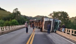 Um caminhão tombou e o trânsito está completamente parado na BR-392, nas proximidades de Santana da Boa Vista, na manhã desta segunda-feira, 27. Segundo informações de populares uma carreta teria tombado próximo à entrada da ponte, o que teria provocado a interrupção do fluxo de veículos na rodovia.