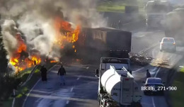A colisão ocorreu no quilômetro 272 da rodovia e resultou em um incêndio logo após o impacto, bloqueando completamente o trânsito nos dois sentidos. Segundo informações preliminares, um dos caminhões transportava soja e o outro levava uma carga de frutas.