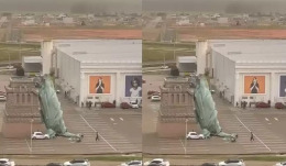 Imagens que circulam nas redes sociais mostram a estátua tombando lentamente. Um automóvel estava estacionado próximo à queda.